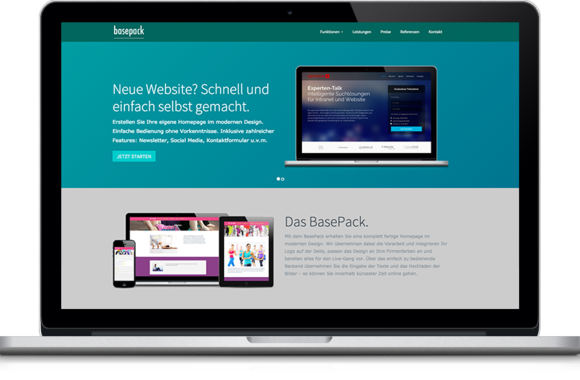 Mit dem basepack erhalten Sie eine komplett fertige Homepage im modernen Design. Wir übernehmen dabei die Vorarbeit und integrieren Ihr Logo auf der Seite, passen das Design an Ihre Firmenfarben an und bereiten alles für den Live-Gang vor. Über das einfach zu bedienende Backend übernehmen Sie die Eingabe der Texte und das Hochladen der Bilder – so können Sie innerhalb kürzester Zeit online gehen.